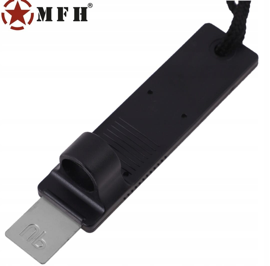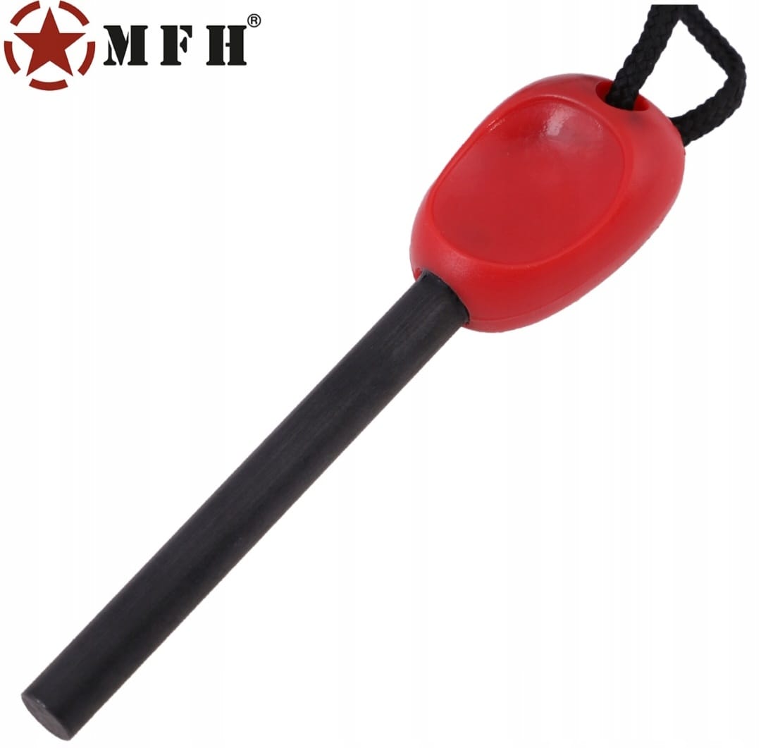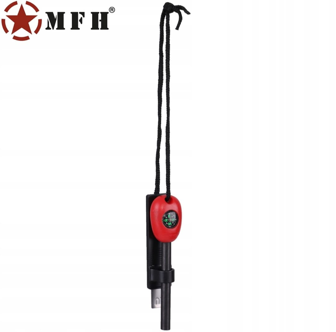 Praktyczne krzesiwo ferrocerowe MFH z wbudowanym kompasem, iskrownikiem i sznurkiem, wytwarzające iskry do 3000°C, umożliwia szybkie rozpalenie ognia w każdych warunkach, a kompaktowa, czerwona obudowa ułatwia użycie i odnalezienie w terenie.