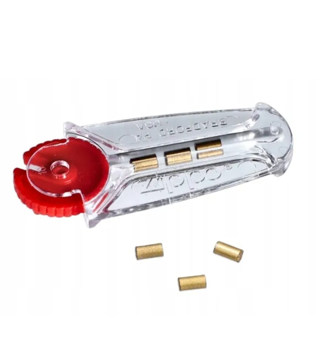Oryginalny zestaw sześciu kamieni do zapalniczek benzynowych Zippo. Praktyczny, pojemnik z tworzywa sztucznego ułatwia wymianę, przenoszenie i przechowywanie kamieni.